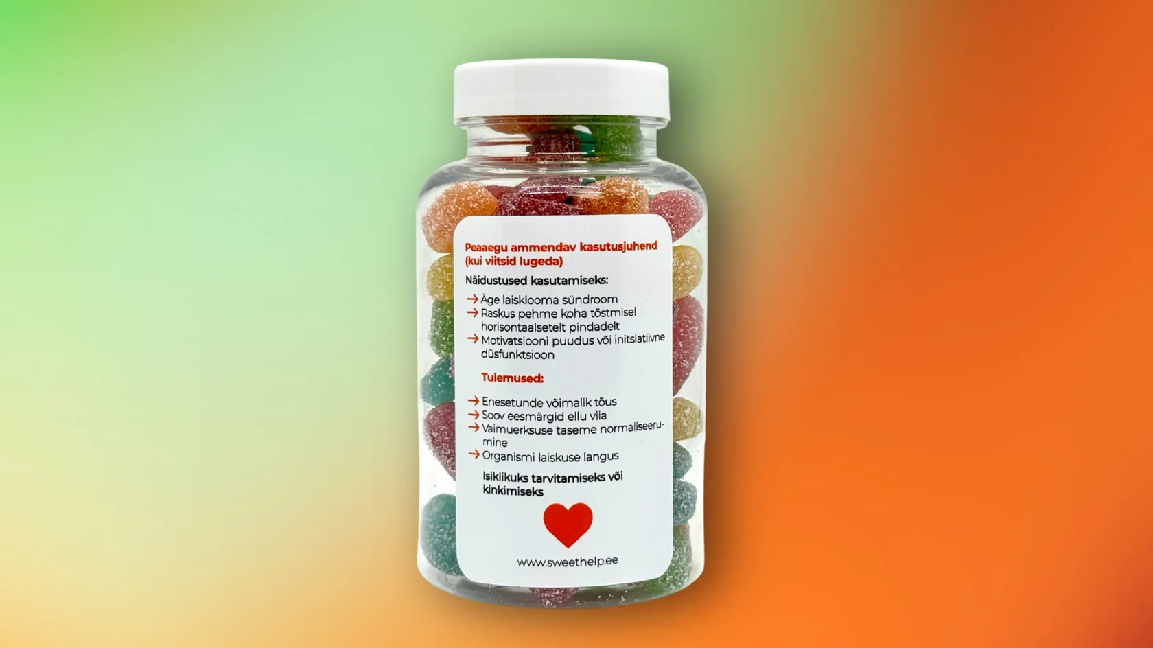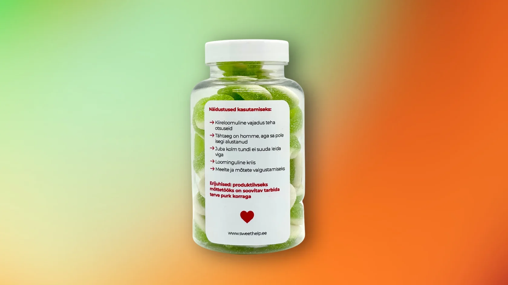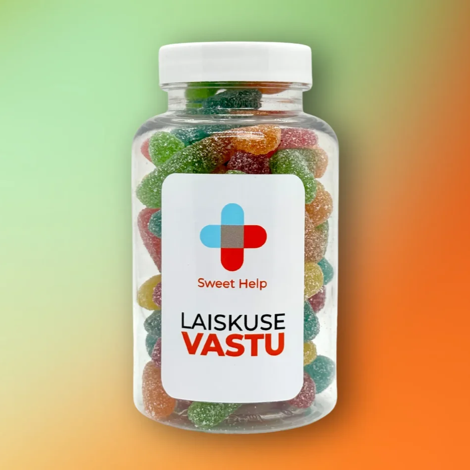 Koostisosad: glükoosisiirup, suhkrur, vesi, želatiin, happesuse regulaator: sidrunhape, puuviljamahla kontsentraat 1,25%, povidijamahlak kontsentraat 1,25%, kookosõli, karnaubavaha; happesuse regulaator: sidrunhape, toiduvärv: kurkumiin, ekstrakt spirulina kontsentraat, musta porgandi kontsentraat. Toitumisalane teave 100g kohta: energeetiline väärtus 1418kJ/334kcal; rasvad 0,2g, millest küllastunud rasvhapped 0,2g; süsivesikud 78g, millest suhkrud 69g; valgud 4g; sool 0,012g. Pakendaja: Tasty Help OÜ, Pärksi, Lääne-Nigula vald 91201, info@sweethelp.ee. Parim enne: vt. pakendilt. Netokaal 180g.