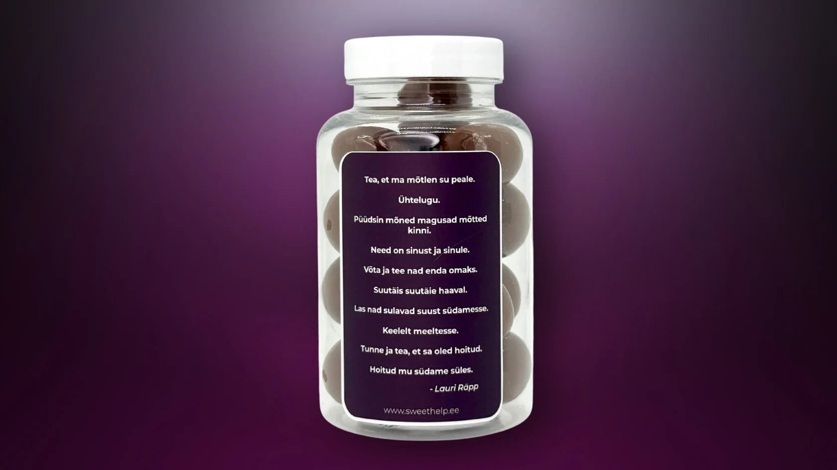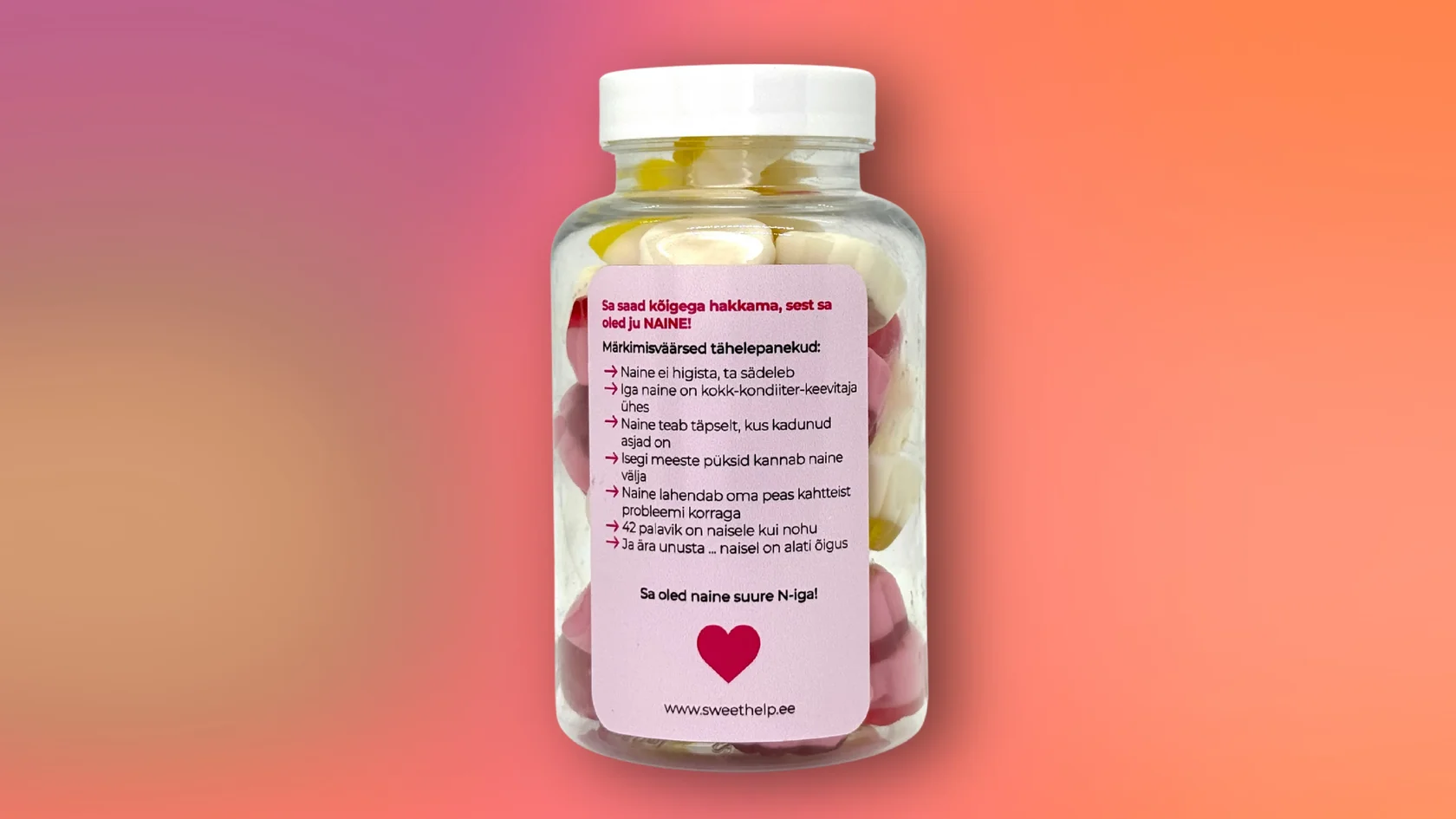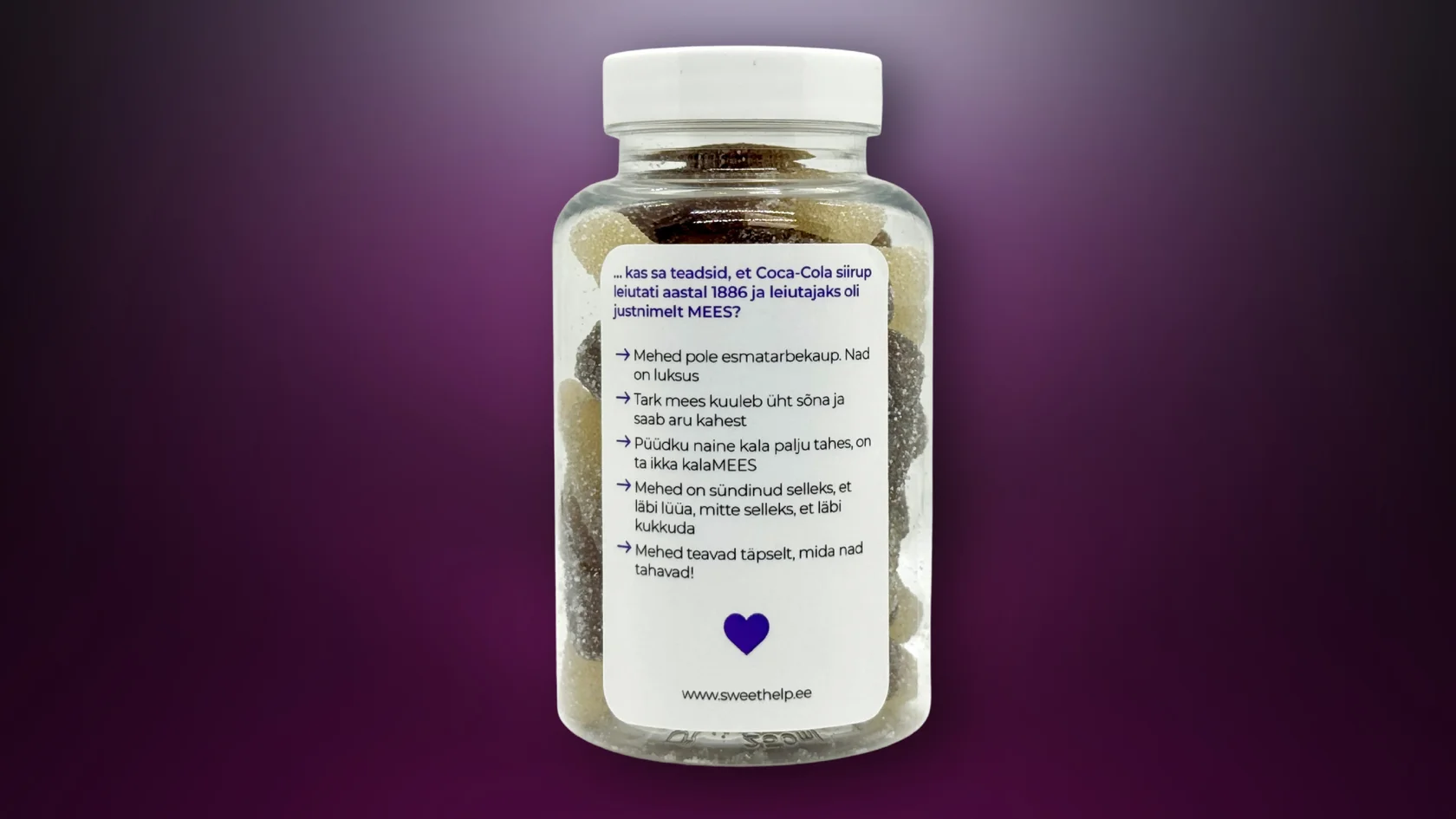 Koostisosad: Glükoosisiirup, suhkur, modifitseeritud kartulitärklis, želatiin, sidrunhape, piimhape, õunhape, happesuse regulaator: kaltsiumtsitraat; lõhna- ja maitseained, toiduvärv: karmiin, kurkumiin, briljantsinine FCF; palmirasv. Toitumisalane teave 100g kohta: energeetiline väärtus 1430 kJ/336 kcal; rasvad 0,1g, sellest küllastunud rasvhapped 0,1g; süsivesikud 77g, sellest suhkrud 48g; valgud 4,3g; sool <0,2g, kiudained 0,1g. Pakendaja: Tasty Help OÜ, Tartu mnt. 30-26, Tallinn 10115, info@sweethelp.ee, parim enne: vt. pakendilt. Netokaal 180g.